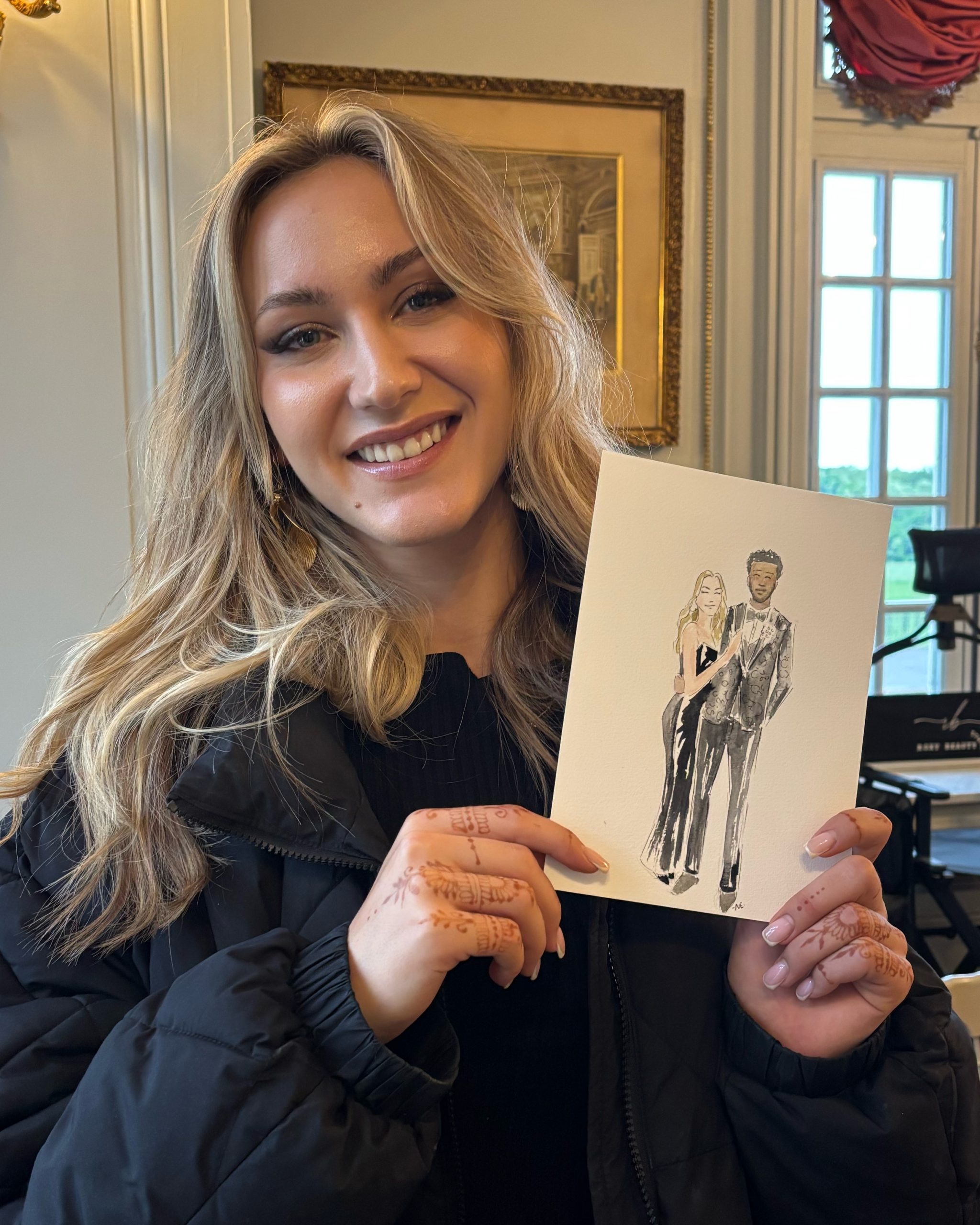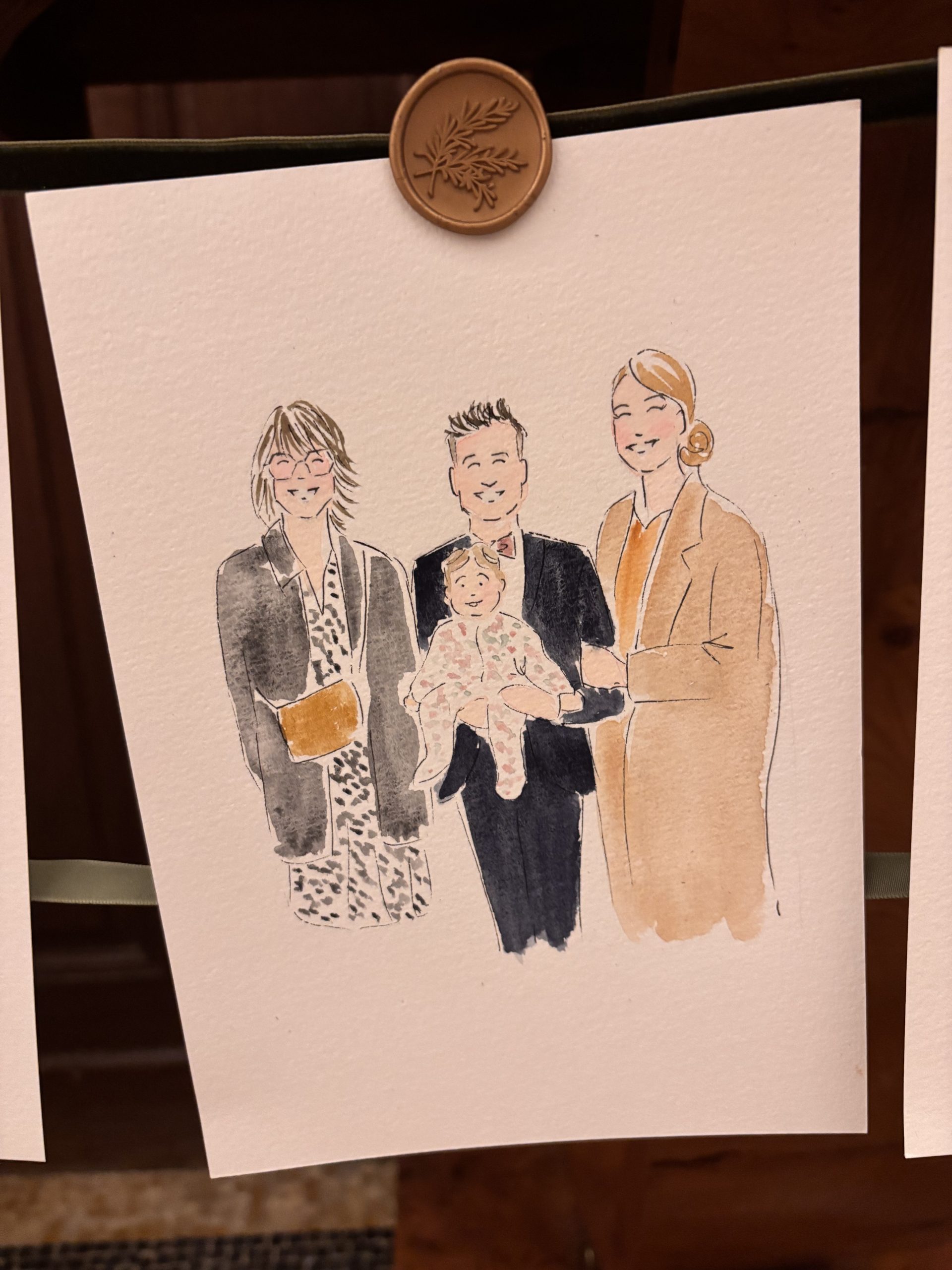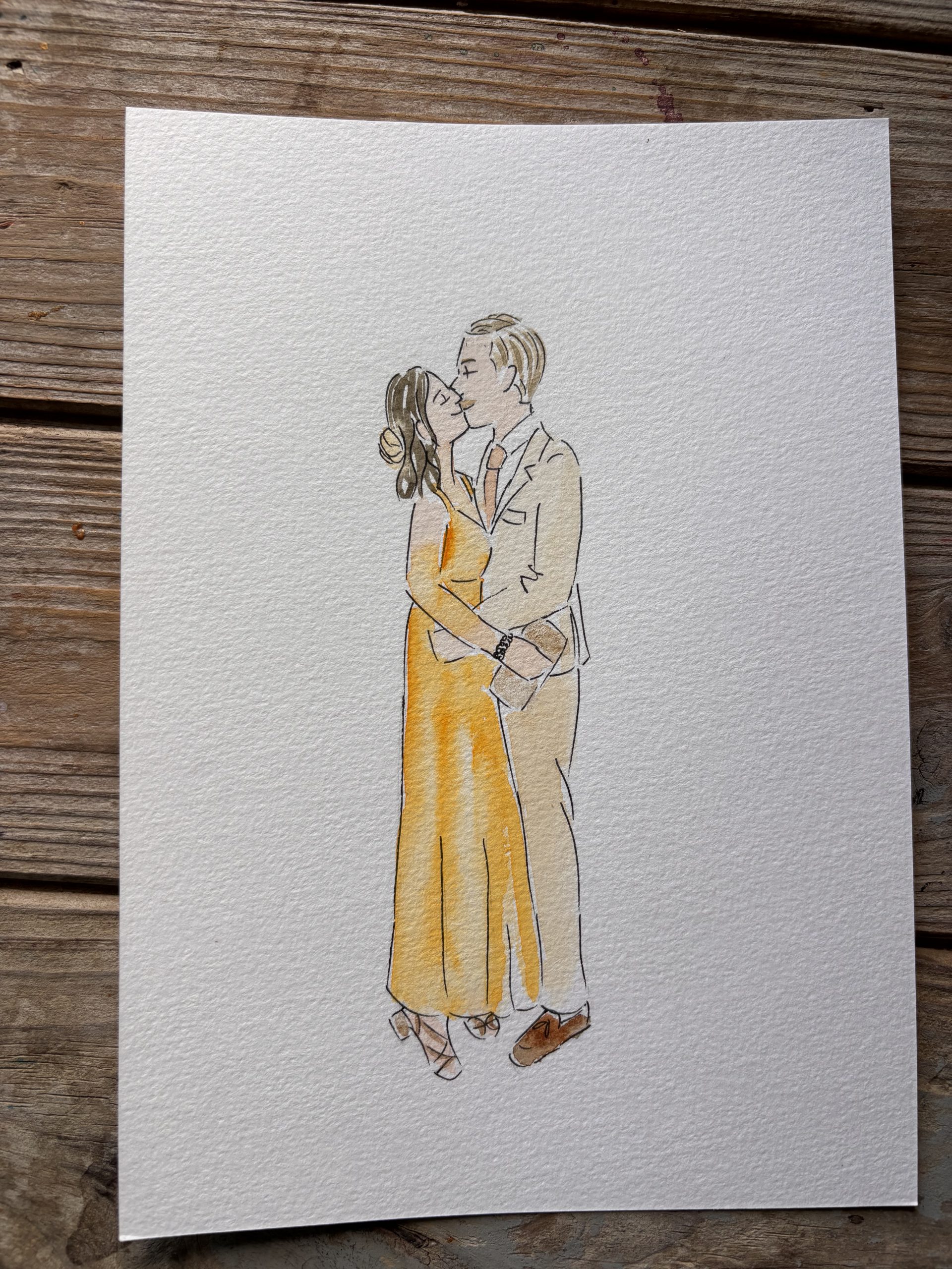 Portrait réalisé en style croquis, silhouettes stylisées dessinées au feutre noir et peintes à l’aquarelle, format A5